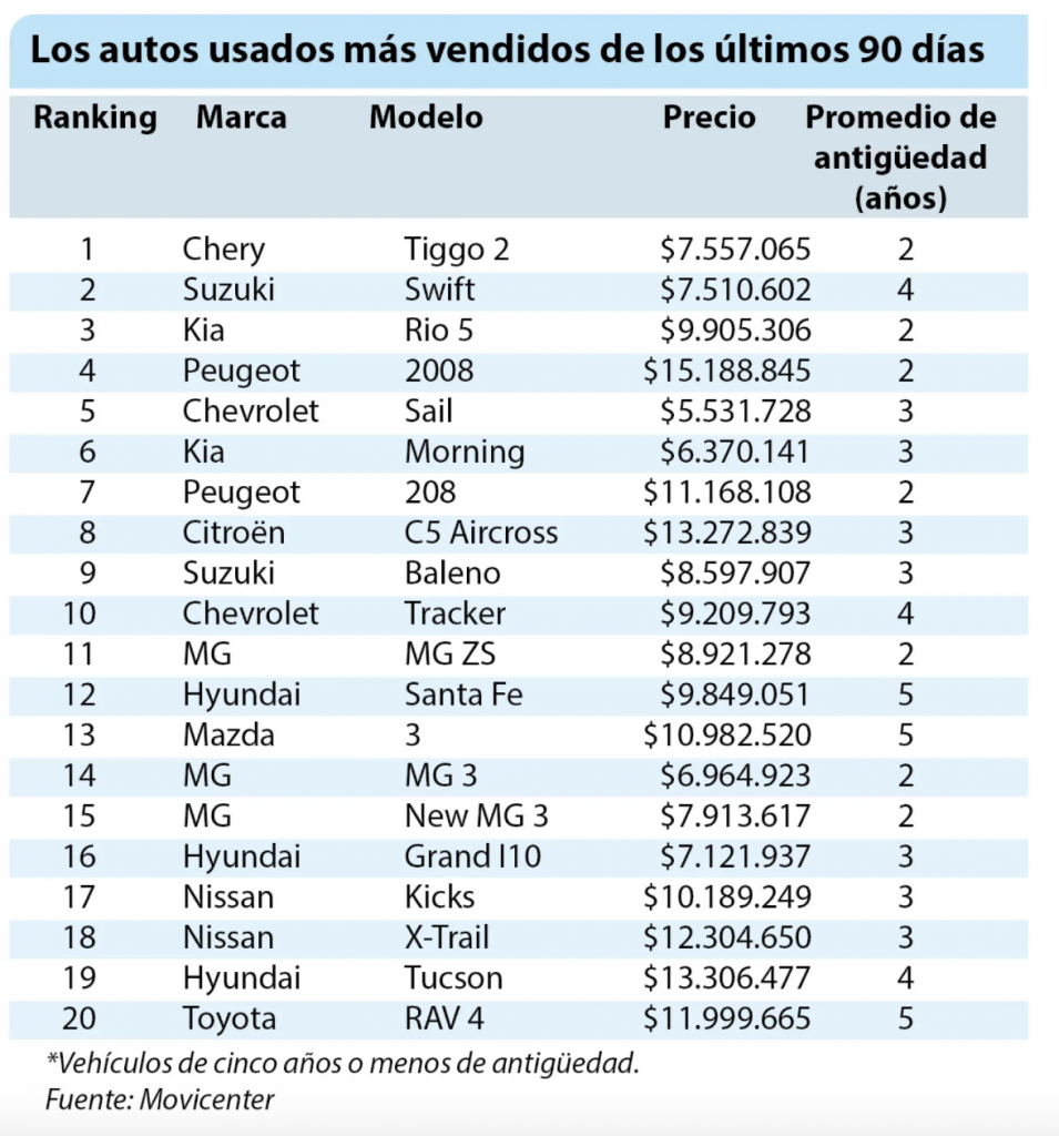 Una buena muestra es la que elaboró el centro de venta automotriz Movicenter, con los 20 modelos de autos usados con máximo de cinco años de uso más vendidos en los últimos tres meses. Fueron con 1.832 transacciones cuyo precio promedio fue $9.693.285. En la tabla que acompaña esta nota se detalla que el modelo que más se llevó en las automotoras fue el crossover Chery Tiggo, con dos años de antigüedad de promedio y a un precio de $7.557.065. Le siguió el Suzuki Swift con cuatro años de uso a $7.510.602 promedio; y, en tercer lugar, el Kia Rio 5, con precio promedio de $9.905.306 y dos años de circulación. El más costoso del ranking de los 20 más comprados fue el Peugeot 2008, que con dos años de antigüedad se vendió en $15.188.845. El más económico fue el Chevrolet Sail por $5.531.728.